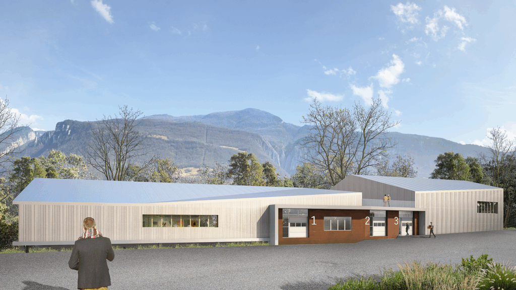 Matériaux et système mis en œuvre : Structure béton et métallique, Menuiserie aluminium DV à rupture thermique, BSO motorisés, Bardage aluminium, Ventilation double flux avec récupération des calories, Déshumidificateur de l’air